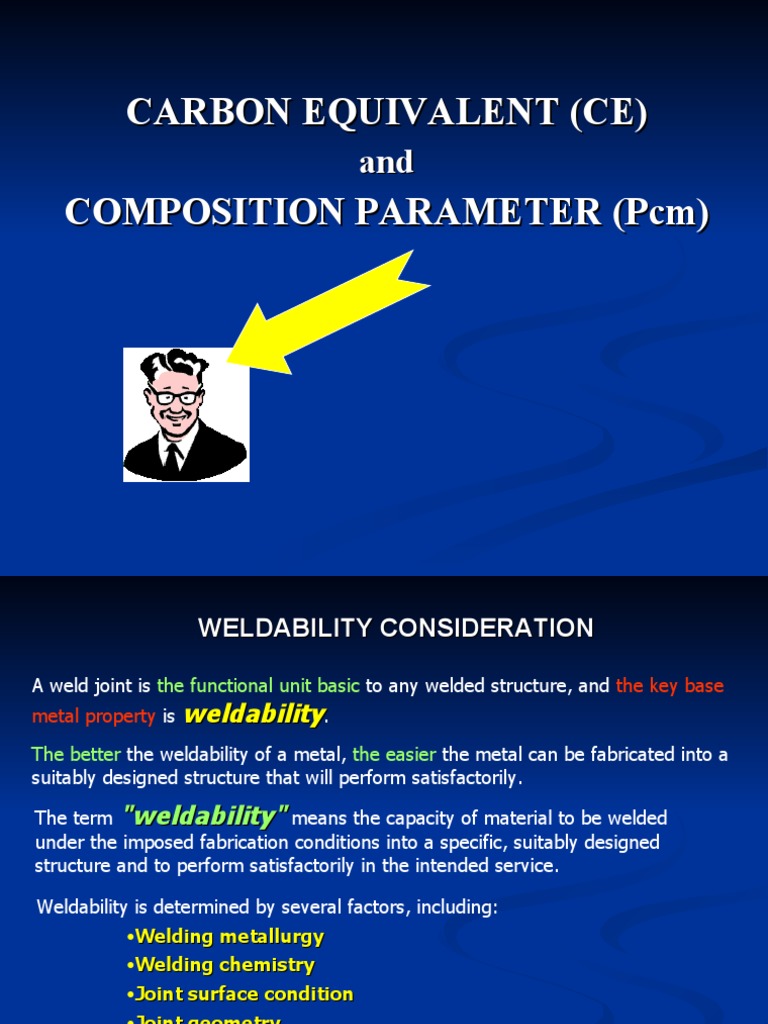The carbon equivalent of steel is the conversion of the content of alloying elements in steel with carbon included which has an effect on hardening cold cracking and. Carbon equivalent ce formulae were originally developed to assign a numerical value for a given steel composition. Pcm is an acronym for critical metal parameter.